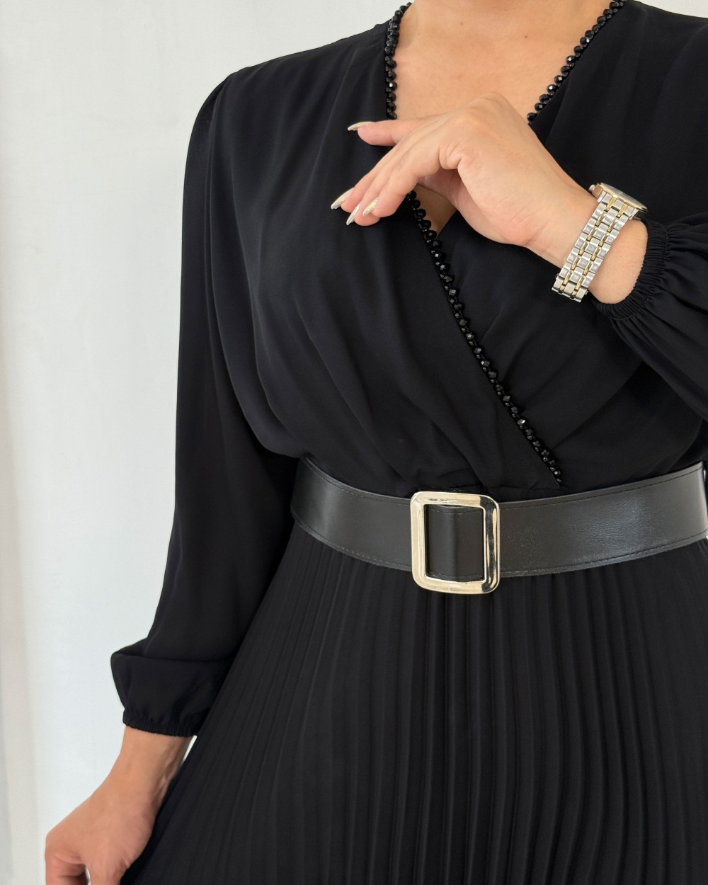 دور یقه سنگدوزی شده و یه کمربند از جنس خودش داره